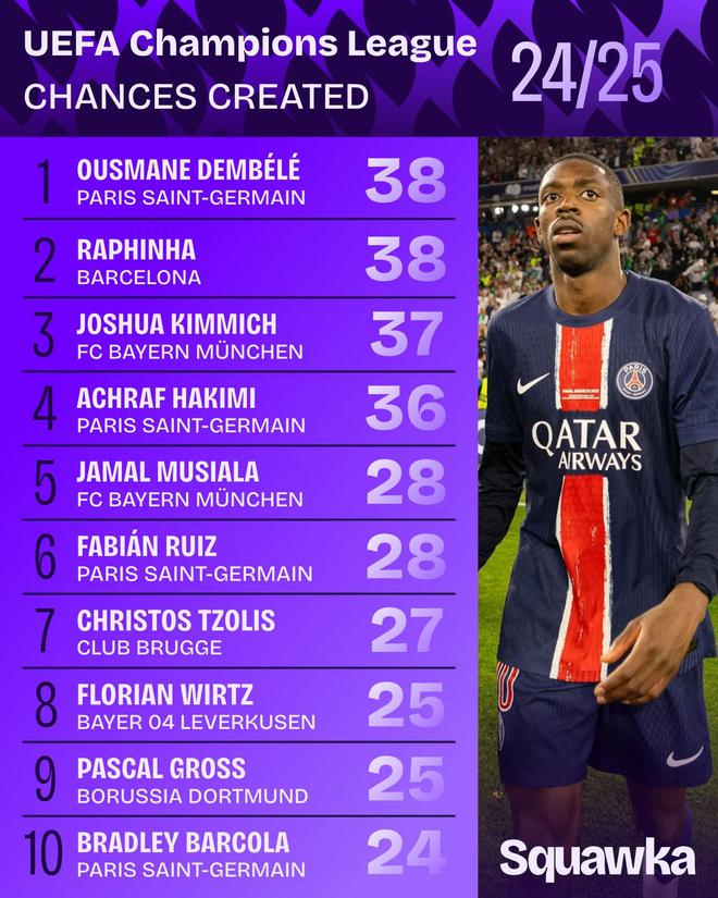 24/25賽季歐冠創(chuàng)造機會榜:登貝萊和拉菲尼亞以38次并列榜首