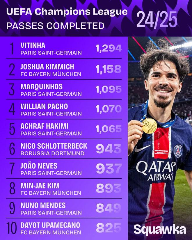 24/25賽季歐冠完成傳球榜:維蒂尼亞1294次高居榜首,基米希第二