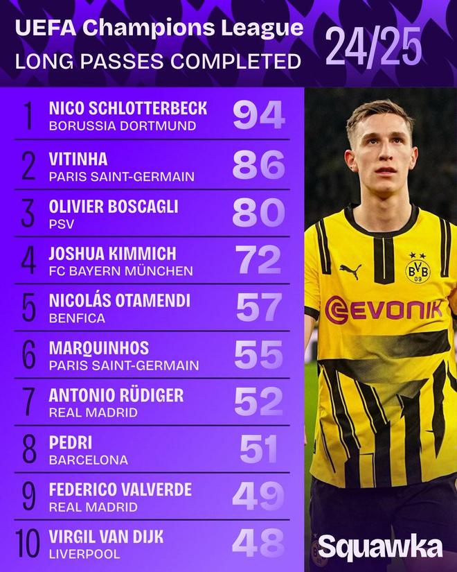 24/25賽季歐冠完成長傳榜:施洛特貝克94次居首,維蒂尼亞第二