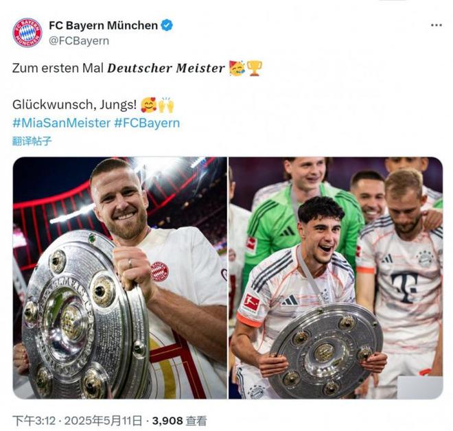 拜仁曬首次贏得德甲冠軍成員照片:孔帕尼、凱恩、戴爾領(lǐng)銜