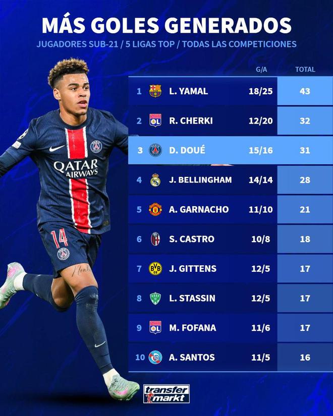 歐冠決賽造3球,杜埃本賽季五大聯(lián)賽U22參與進(jìn)球數(shù)升至第三