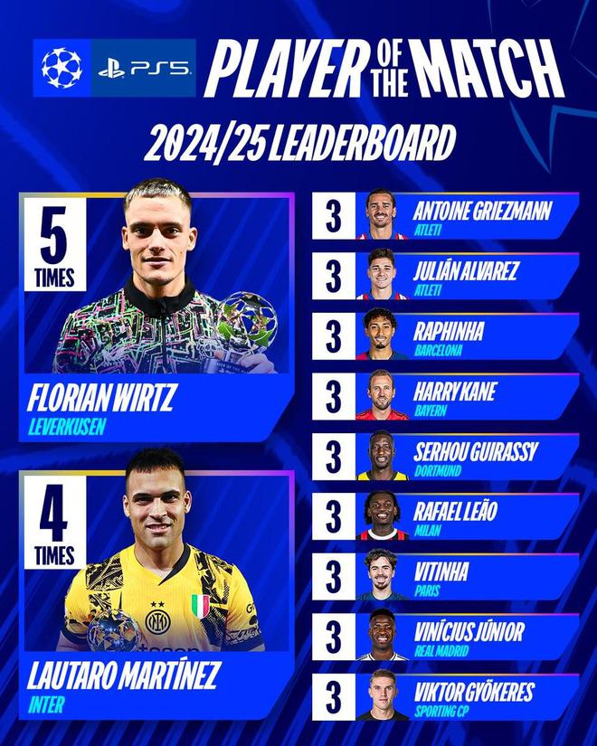 維爾茨5次獲全場最佳本賽季歐冠最多 勞塔羅4次第二&共9人獲3次