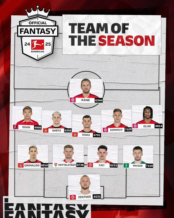 德甲官方賽季最佳陣:凱恩領(lǐng)銜,維爾茨、奧利塞、堂安律在列