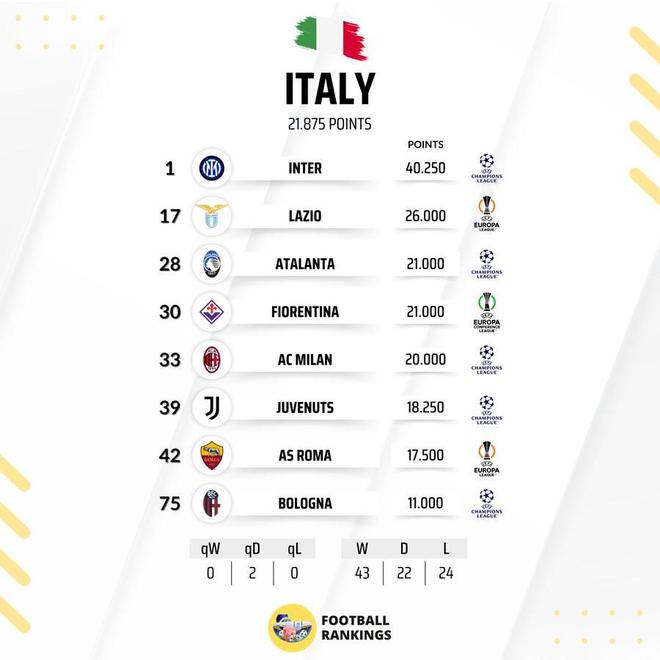 意大利球隊(duì)歐戰(zhàn)積分排名:國(guó)米歐洲第1,米蘭第33,尤文第39