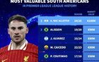 英超南美球員最高身價(jià)top10:麥卡利斯特1億歐登頂